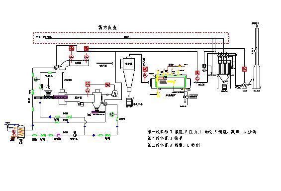 污泥進(jìn)料及廢焦油進(jìn)料系統(tǒng)+旋轉(zhuǎn)窯爐本體+二次燃燒兼集塵器+G-G熱交換+G-L熱交換+ 噴淋吸收塔+霧水分離器+排風(fēng)機(jī)+獨(dú)立煙囪